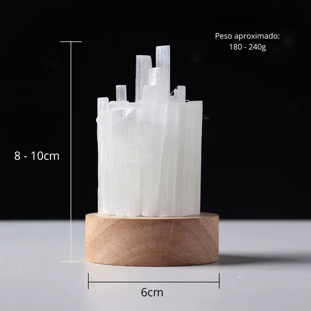 Conhecida como “Luz Líquida”, a Selenita é apreciada como fonte de energia purificadora e calmante. A Luminária Selenita é esculpida à mão em cristal 100% natural, tornando cada peça absolutamente única.