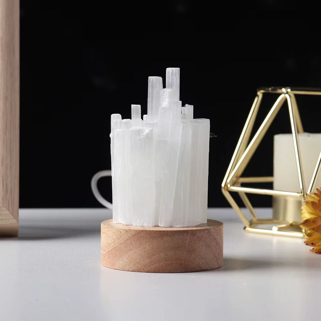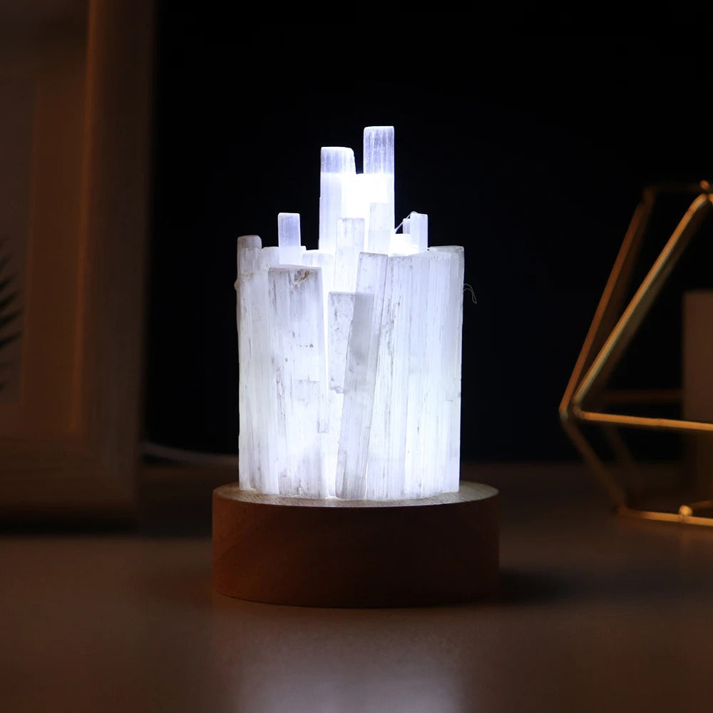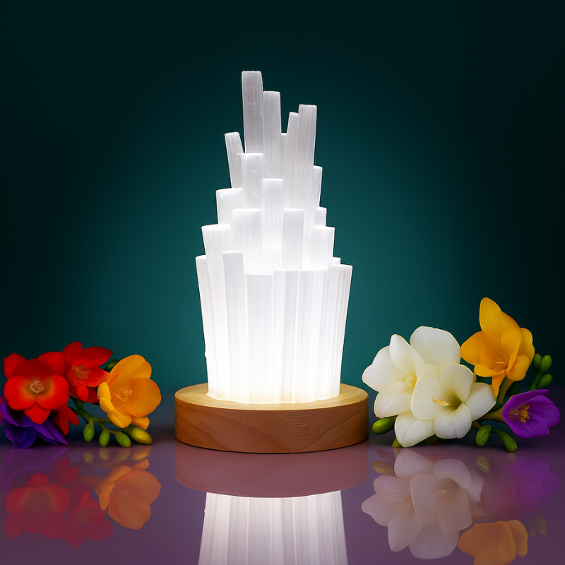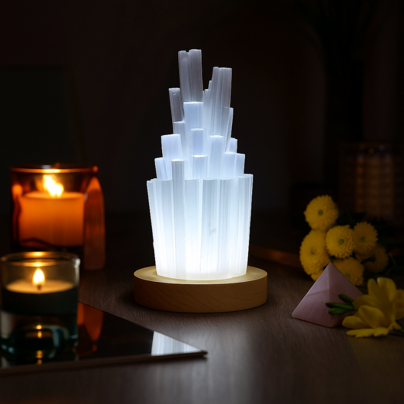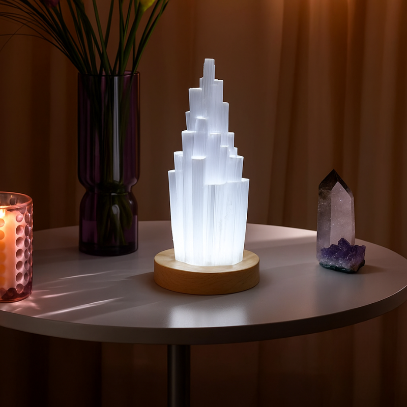 Perfeita para mesas de cabeceira, altares de meditação ou como peça de destaque na decoração, a Luminária Selenita tem um brilho que transforma qualquer espaço. Sua extremidade pontiaguda canaliza energia, ajudando a direcioná-la de acordo com sua intenção – seja para dentro ou para fora.