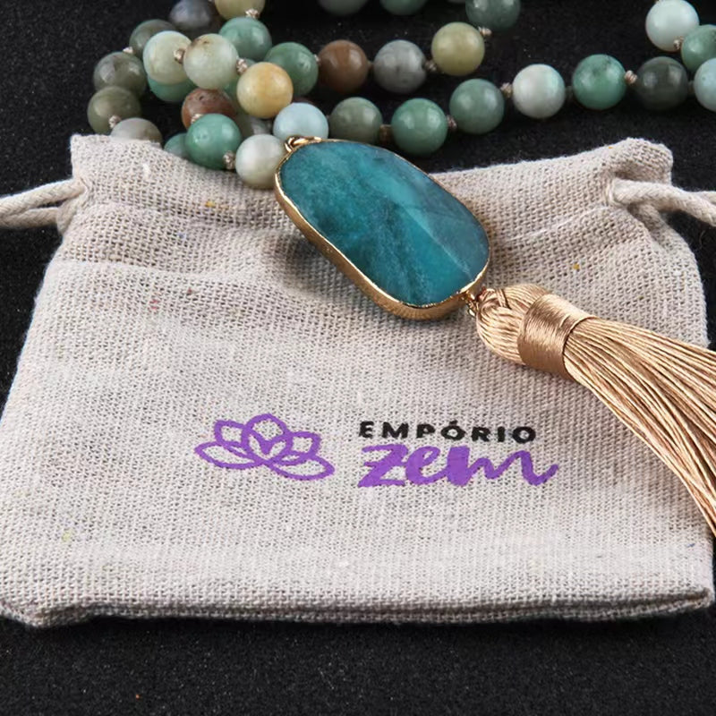 Comece com a Primeira Conta: Segure o Japamala na mão dominante, inicie na primeira conta após o meru (neste modelo, ele é o pingente de pedra natural) e recite sua afirmação.